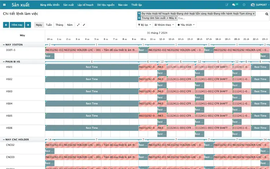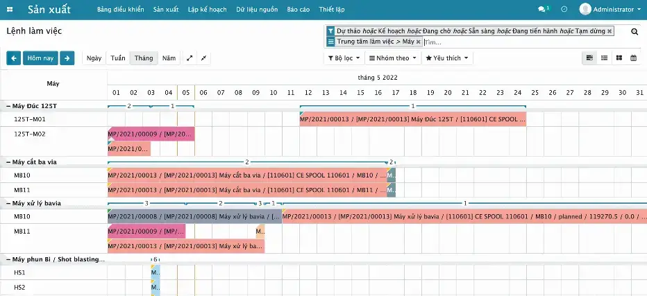 Tính năng quản lý chạy máy của phần mềm quản lý sản xuất cho phép tự động tạo ra Lịch làm việc của từng máy và đồng bộ với các lịch làm việc của các máy khác