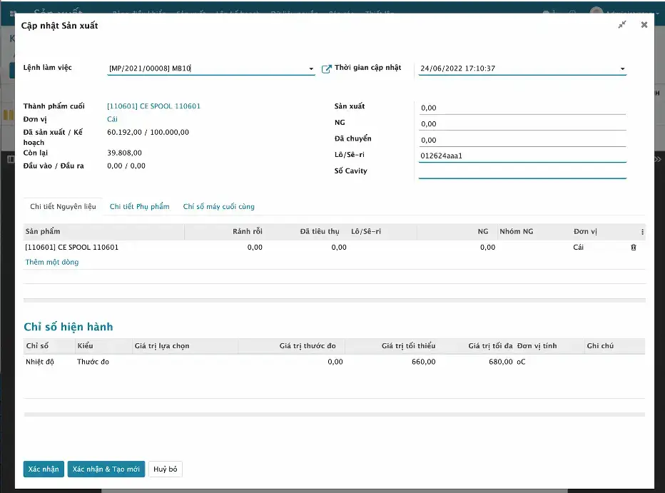 - Cập nhật số lượng sản xuất được
