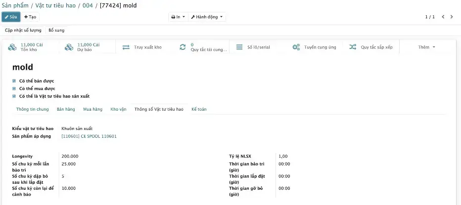 Các vật tư tiêu hao có thể được theo dõi chi tiết theo từng serial, ví dụ từng khuôn đúc có thể được theo dõi riêng số lượng chu kỳ đã sử dụng, tuổi thọ còn lại, số lượng bảo trì đã thực hiện, dự đoán thời điểm bảo dưỡng tiếp theo